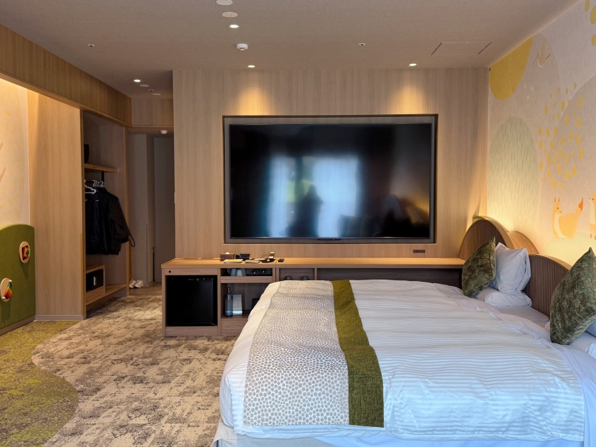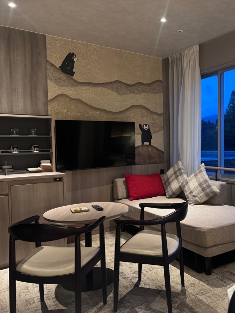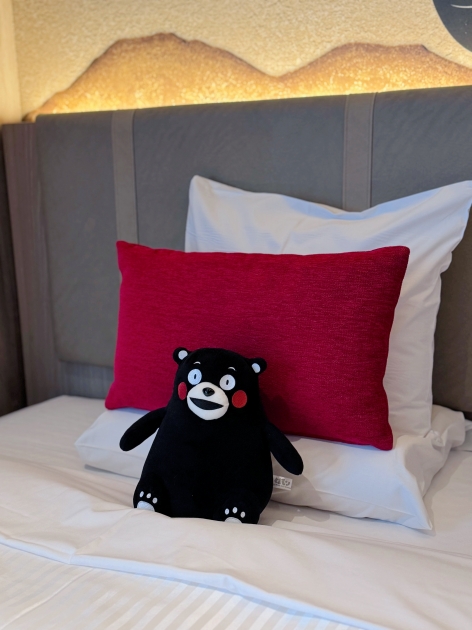 身為熊部長的小粉絲代表,這間房完全是夢中樂園!牆面是阿蘇大地色調➕熊本熊圖案,床上還有不同格的熊部長娃娃,萌度爆表🧸。