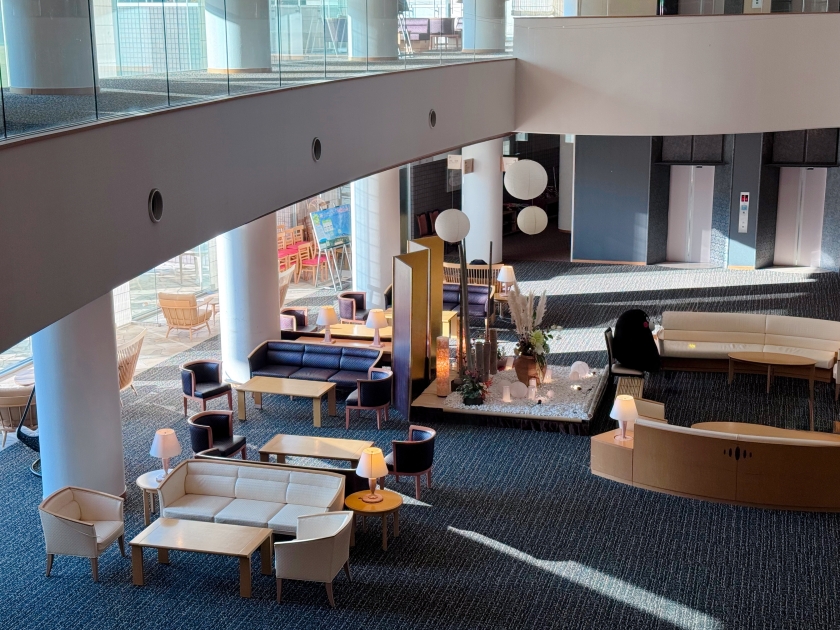 一走進大廳就被療癒!大片落地窗+挑高空間沒有壓迫感,右側就是販售伴手禮與點心的商店。