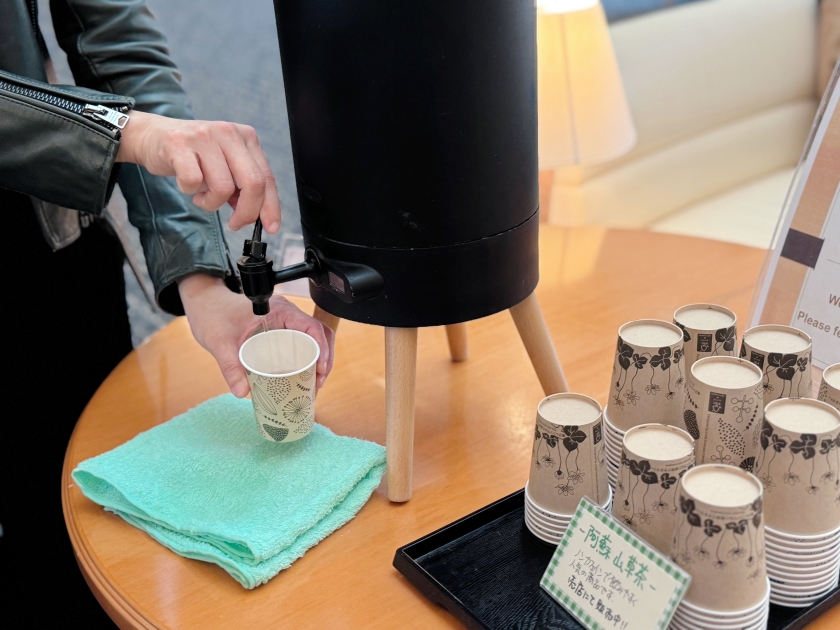 沙發區還有熊本熊部長迎接旅客,以及「阿蘇山草茶」的迎賓茶,完全貴賓級待遇呀💎。