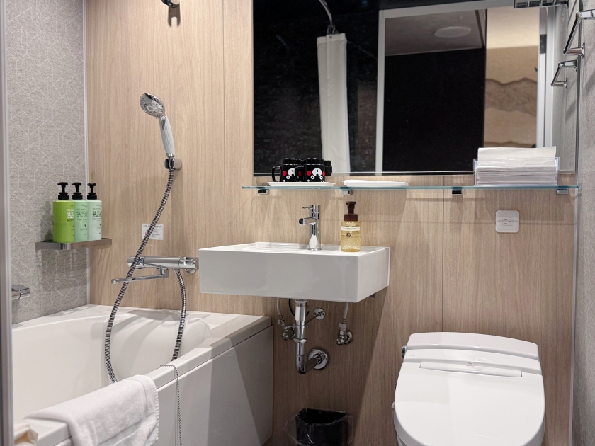衛浴是一體成型設計,雖然我比較喜歡乾濕分離的,但反正都要去泡溫泉,浴室只是刷牙洗臉用。Btw, 連漱口杯都是熊本熊,真的是很極致的熊本熊主題房😆。