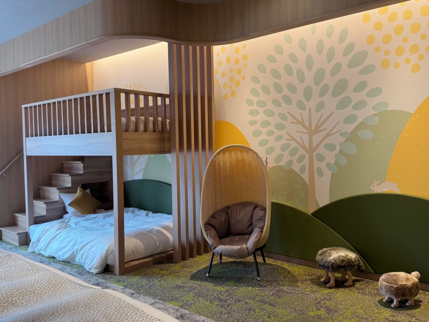 親子旅客激推訂菜苔苔與菜生生一家住的這間「親子露台房」,這間也是10月翻新完畢的,室內走柔和森林系風格,還有可愛狐狸插畫、小帳篷、小孩遊戲區,孩子玩瘋、爸媽放鬆兩不誤。