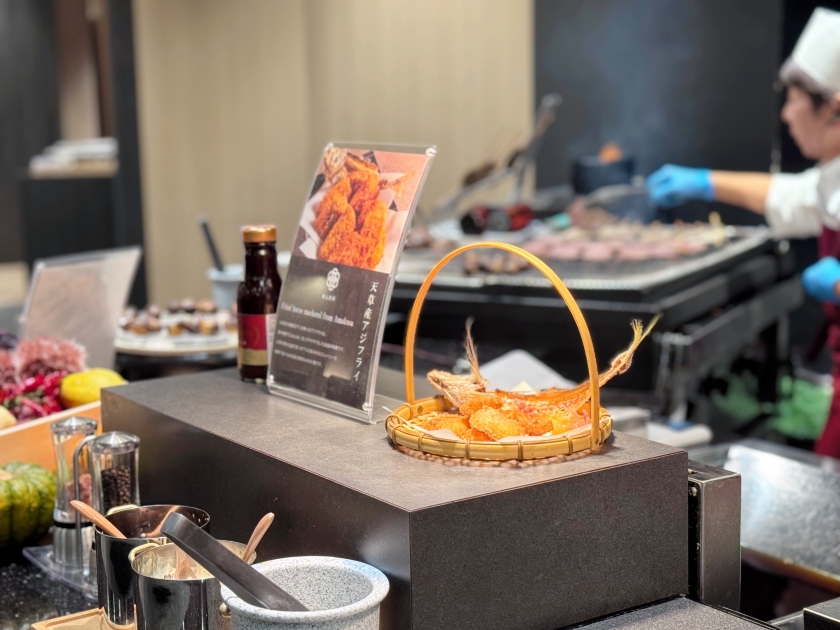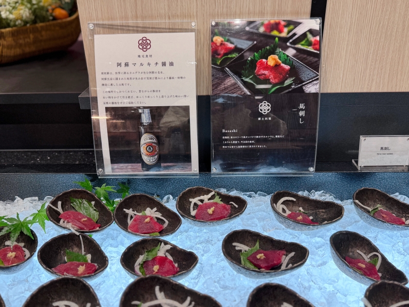 各種熟食、生魚片壽司、在地料理通通有,像熊本赤牛、品牌豬及馬肉做成的「阿蘇漢堡排」、馬肉刺身、天草炸竹莢魚、阿蘇牛奶冰沙都能吃到。