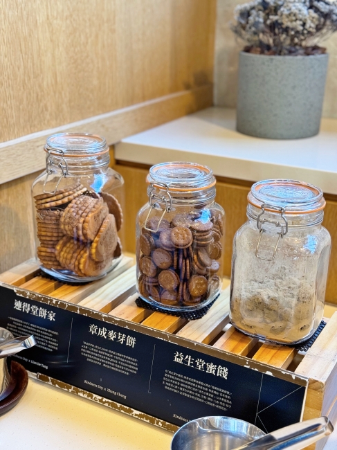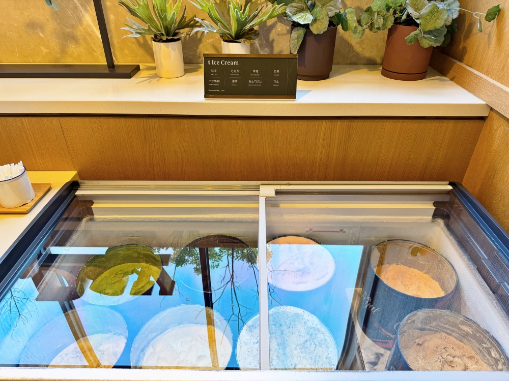 抵達的當天下午辦理完check in,就迎接下午茶點心時光~餐檯上有咖啡和多款茶包,以及8種口味的冰淇淋,通通免費無限爽吃!!!最讓我印象深刻的,就是還有台南在地人氣伴手禮,包含有「連得堂餅家」的手工煎餅、「章成麥芽餅」和「益生堂蜜餞」,不用排隊就先吃一波,太幸福了吧!