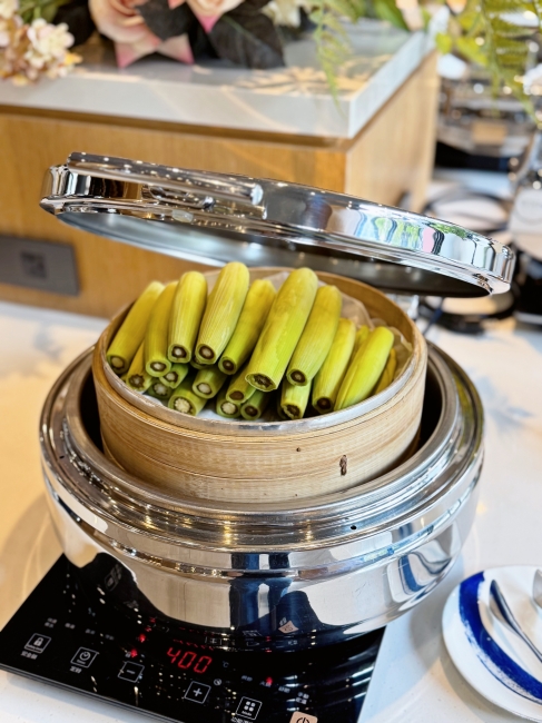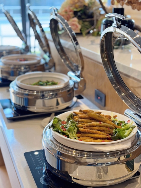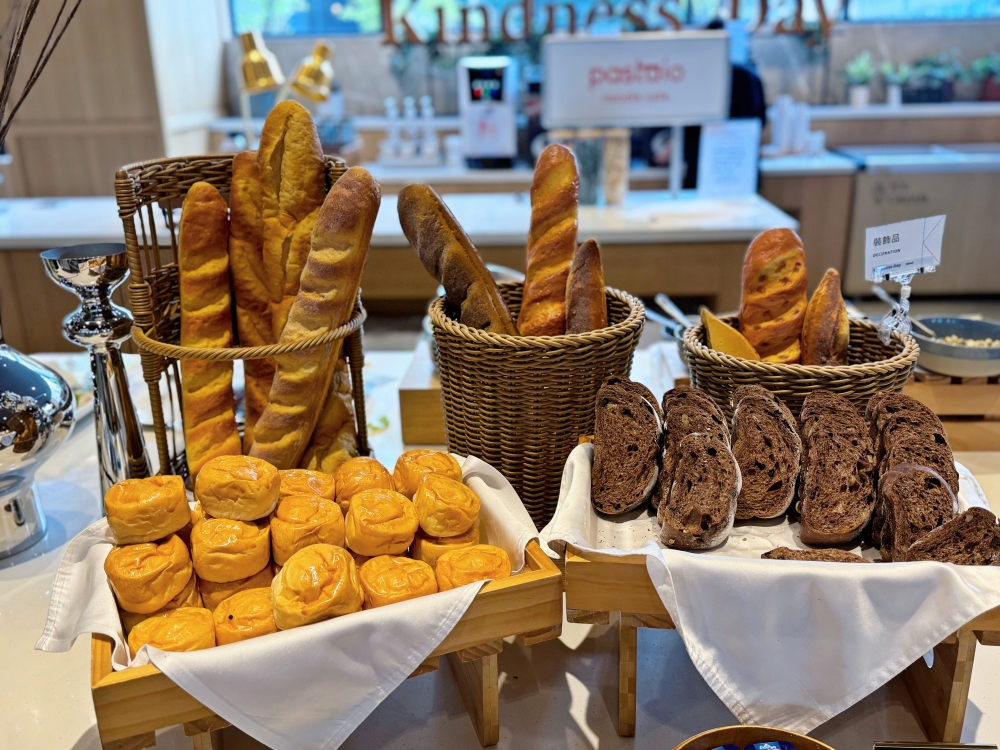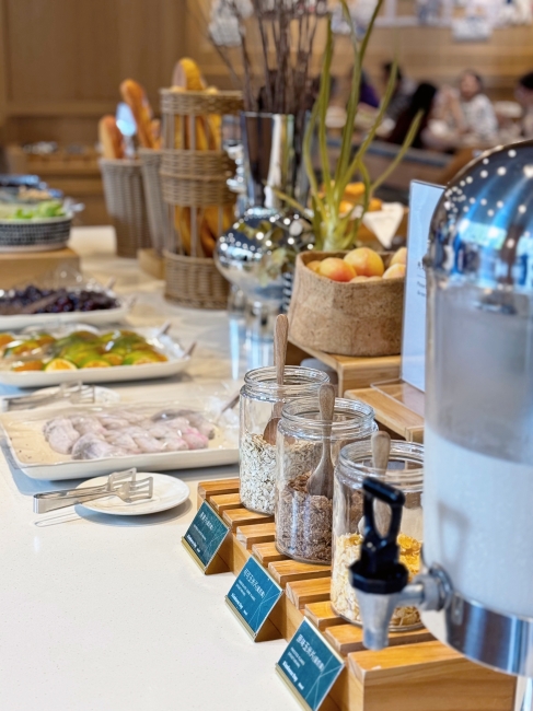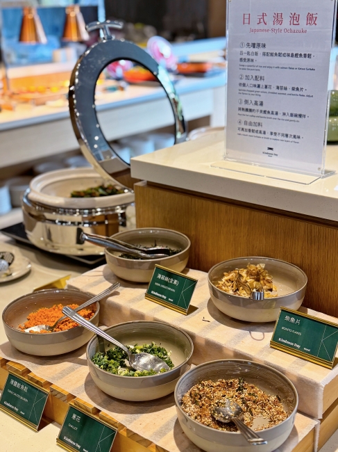 隔天早上的自助早餐同樣精彩,中式熱食不馬虎,炒時蔬、熱粥小菜、炸魚雞丁等多種熱菜;西式麵包、烘蛋、香腸、生菜等等也很齊全,還可以「自製日式茶泡飯」,魚鬆、鮭魚、海苔、柴魚片等配料自己加,倒入高湯完成一碗熱騰騰、香氣四溢的茶泡飯,對於剛起床的胃來說再舒服不過!